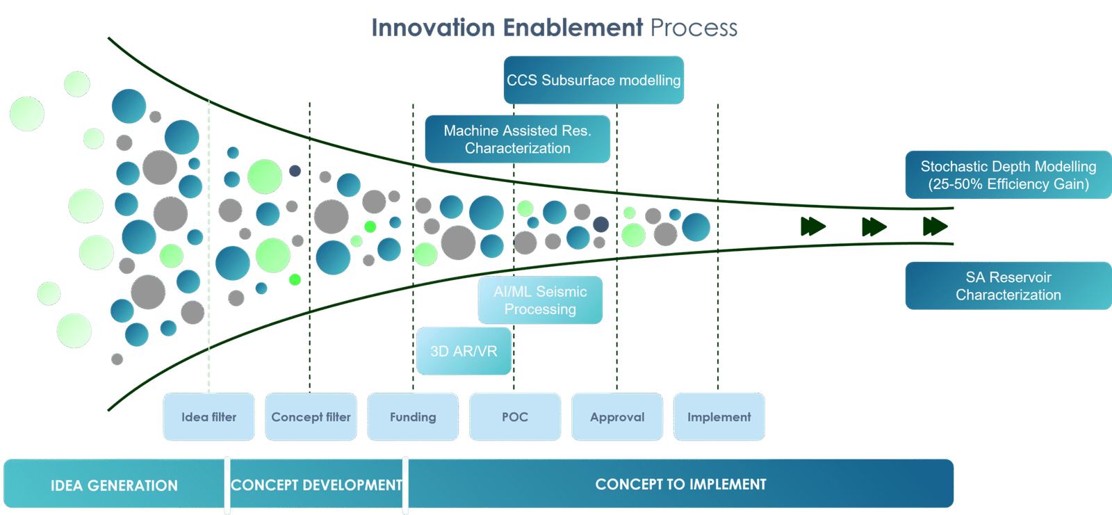 At Energon Consulting Group (ECG), innovation is a disciplined process that transforms vision into measurable outcomes. Our framework spans ideation to implementation, powered by Full Waveform Inversion (FWI), AI/ML-driven interpretation, and AR/VR-based depth modeling. These capabilities integrate into reservoir characterization and field development planning to reduce uncertainty, accelerate decisions, and enable sustainable value in both traditional reservoirs and energy transition projects.
